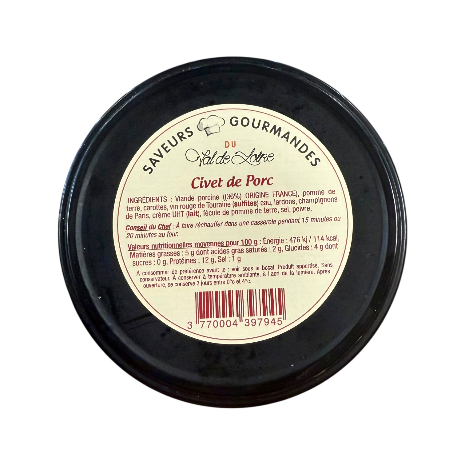 Viande de porc ((36%) ORIGINE FRANCE), pomme de terre, carottes, vin rouge de Touraine (sulfites), eau, lardons, champignons de Paris, crème UHT (lait), fécule de pomme de terre, sel, poivre.