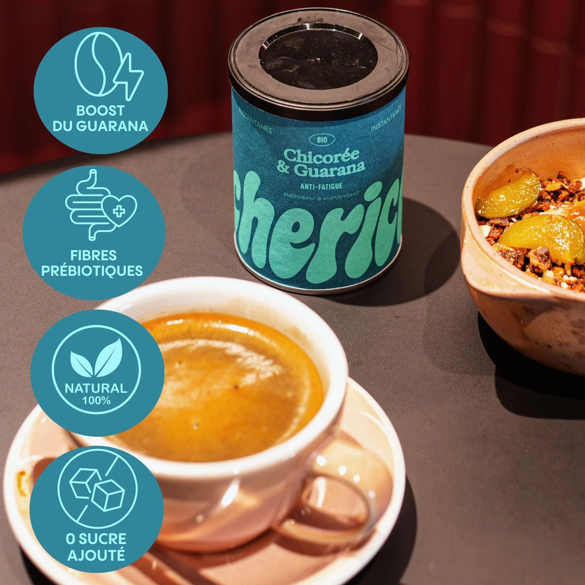 Le coup de fouet sans le coup de mou ! La chicorée pour ses vertus digestives et ses notes de caramel et de noisettes, le guarana pour ses fonctions stimulantes et antioxydantes. Originaire d’Amazonie, le guarana est connu pour sa teneur élevée en caféine naturelle, libérée progressivement, offrant une énergie durable et sans pic.