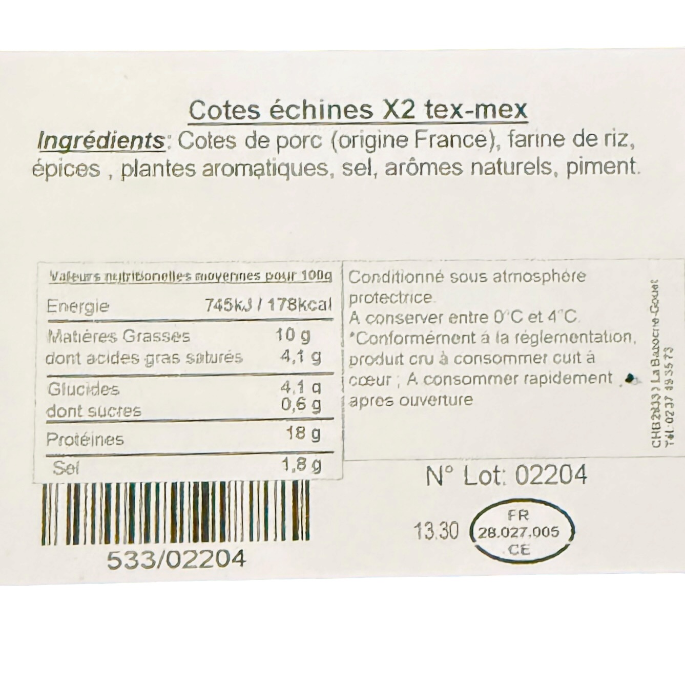 Composition: 2 côtes échine TEX MEX(poids total 430g environ), le calcul du prix s’effectuera en fonction du poids au moment de la livraison dans nos casiers LOCALIE EXPRESS.