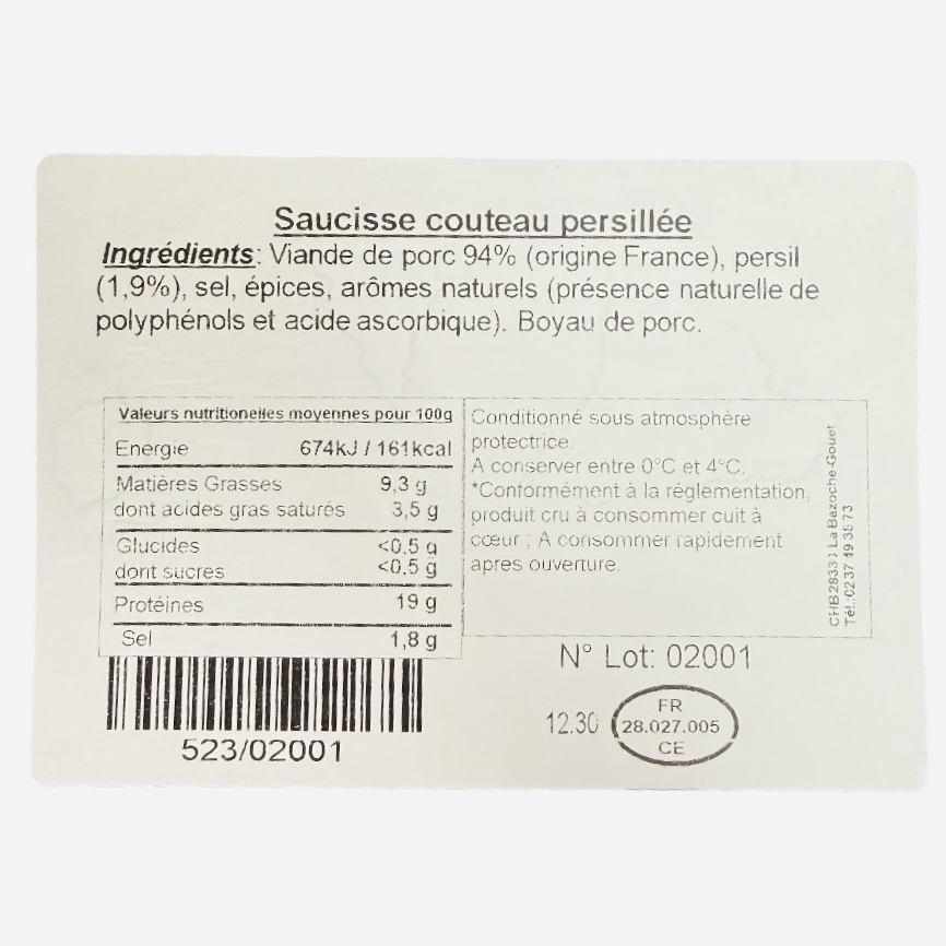Composition: 1 saucisse couteau persillée  (poids total 500g environ).